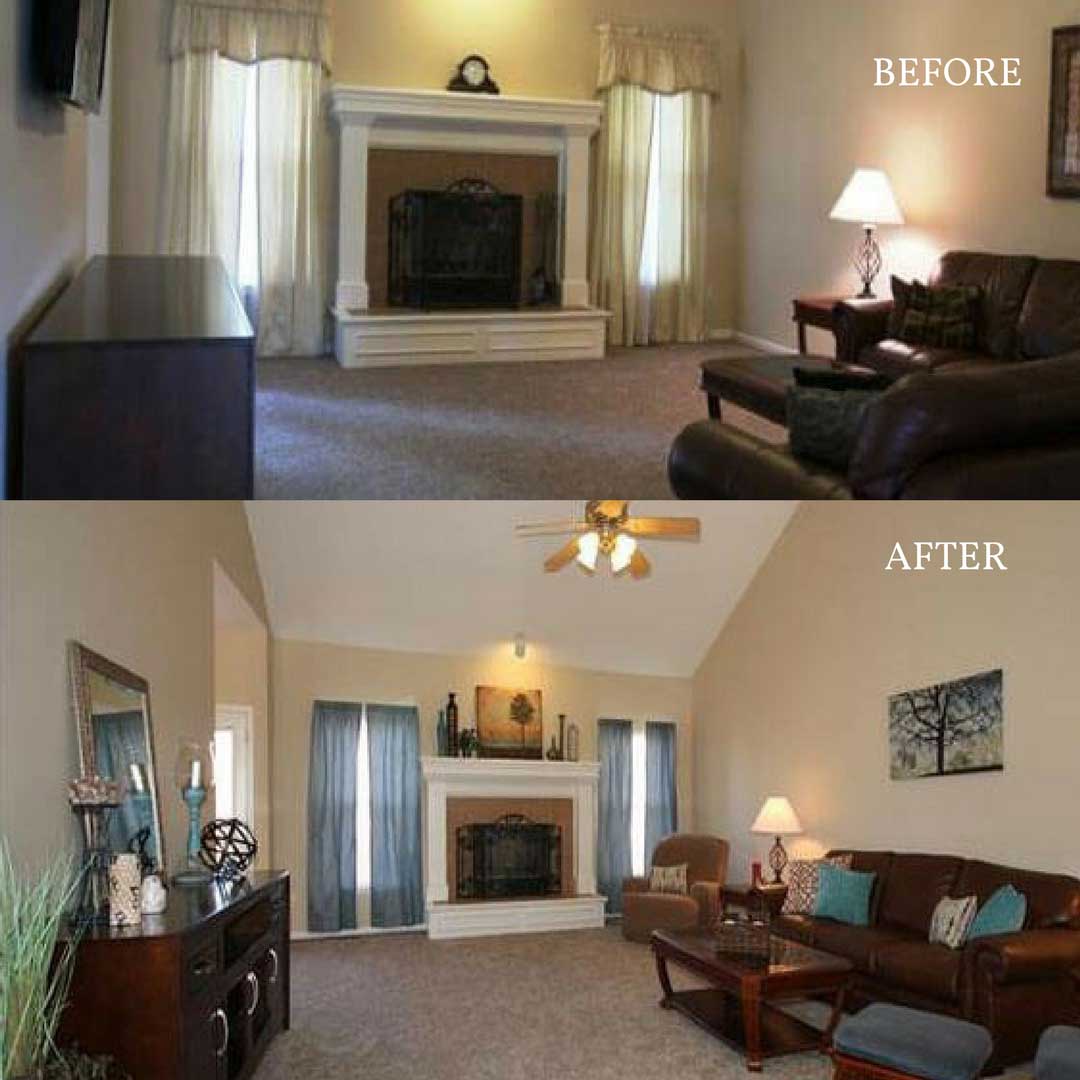 With home staging, less is more. We’ll use a mix of your items and ours to emphasize your home’s highlights. For example, we can use mirrors to make a room look larger. Here are some before and after pictures of our Kansas City area home staging.